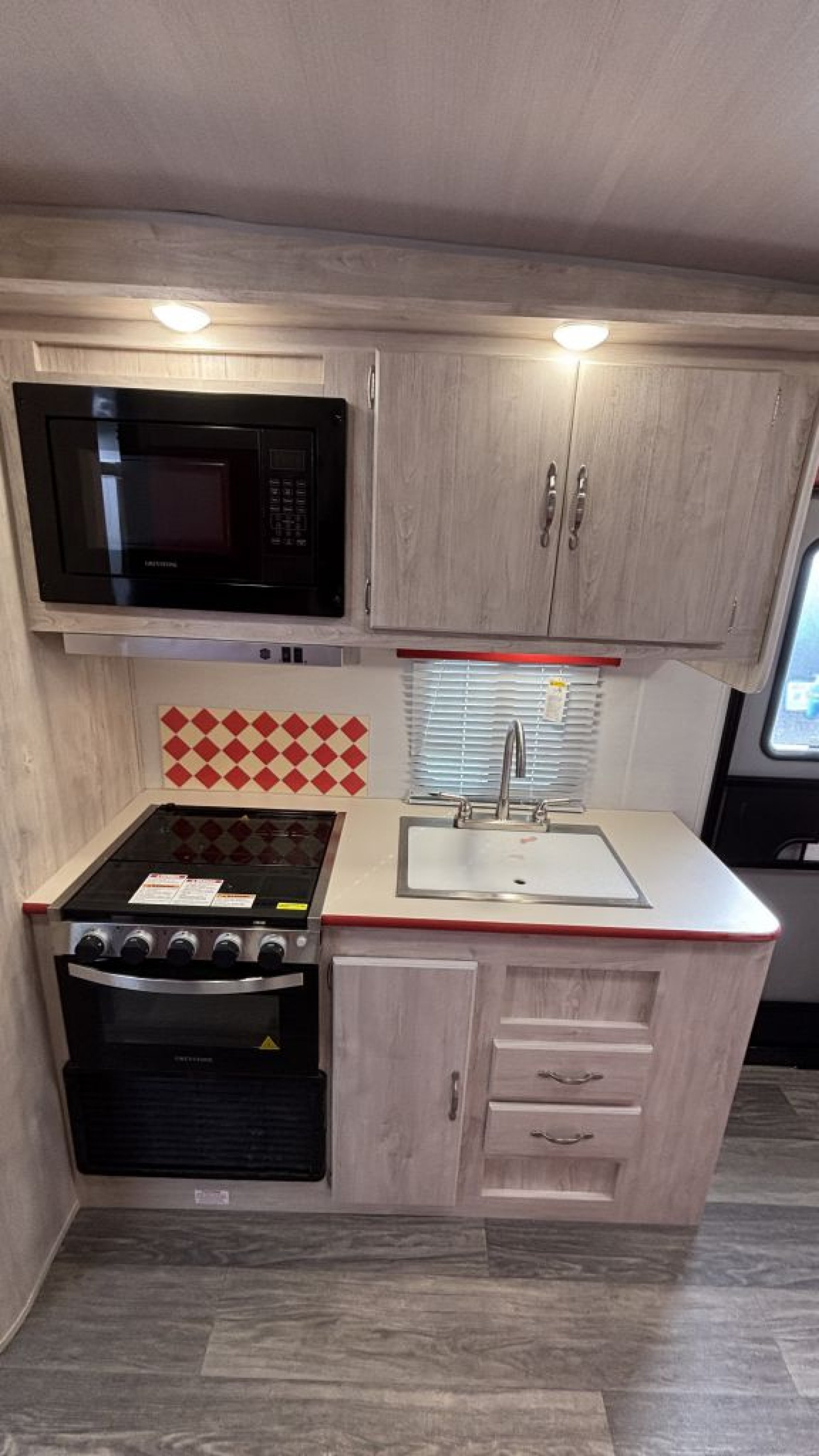 • Kitchen: Three-burner cooktop with oven, microwave, double-bowl sink, 6 cu. ft. 12V refrigerator, and pantry for retro-style cooking.