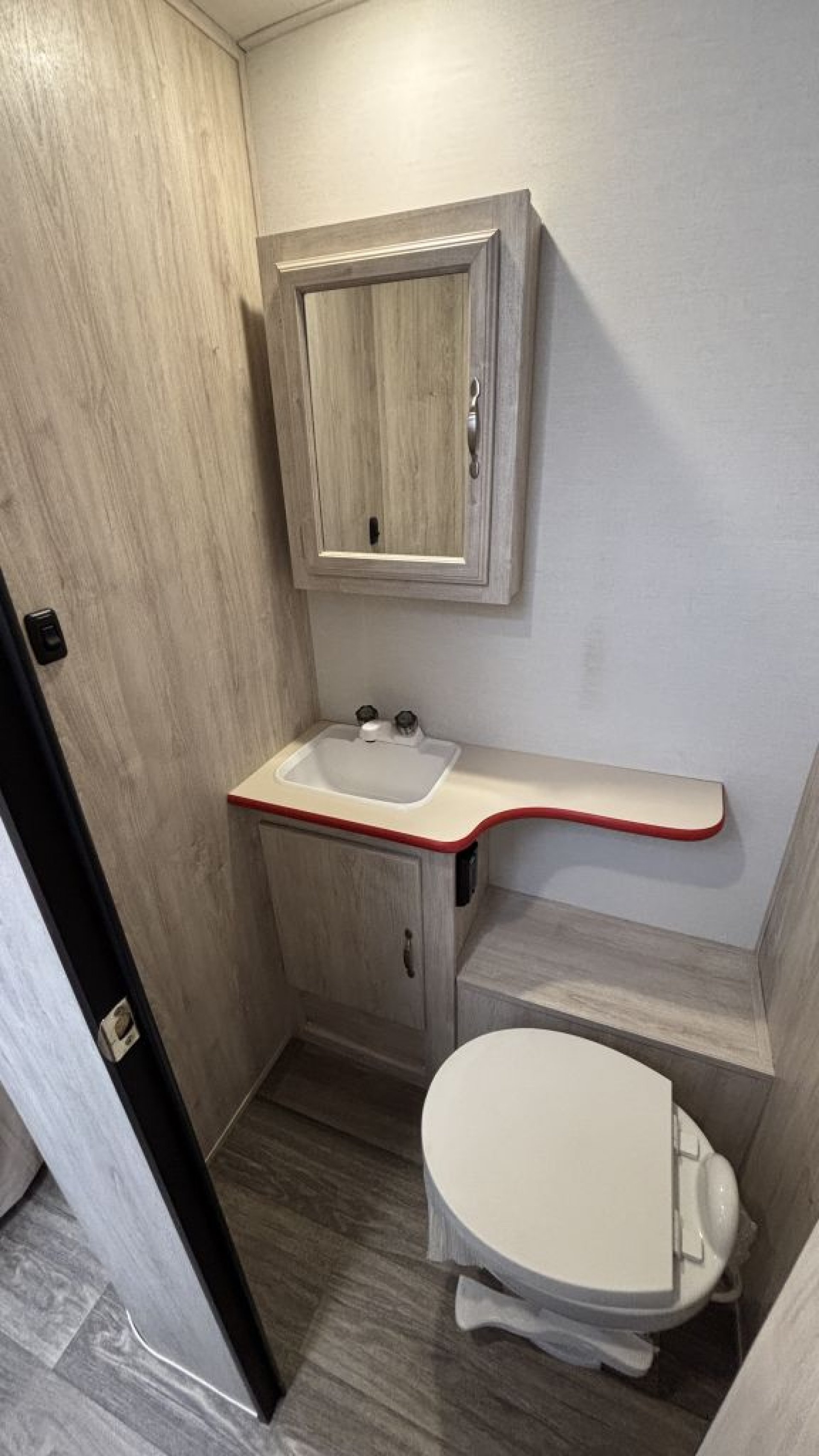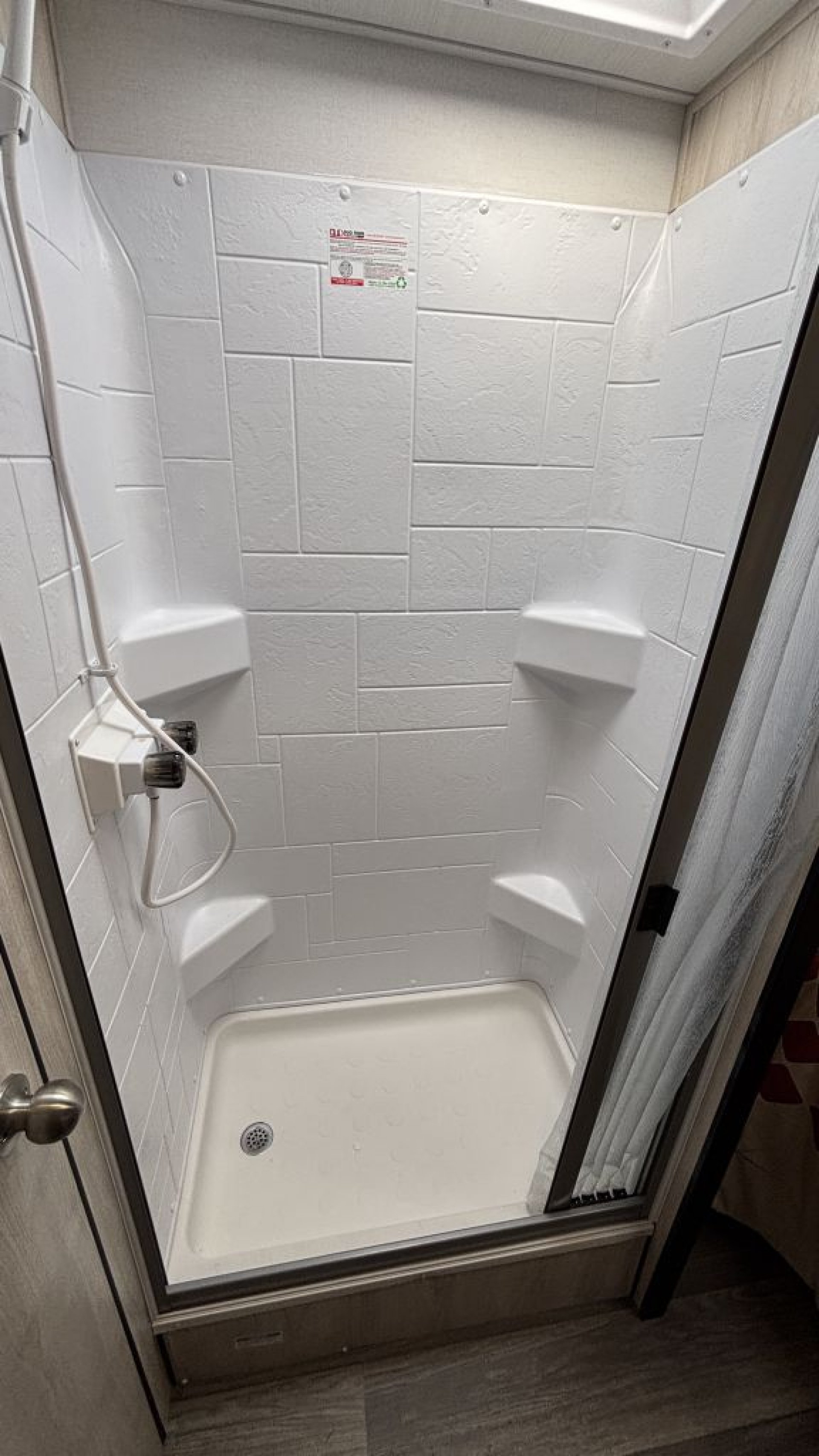 • Bathroom: Full rear bath with 24" x 36" shower, foot-flush toilet, sink, medicine cabinet, and linen storage; skylight for natural light.
