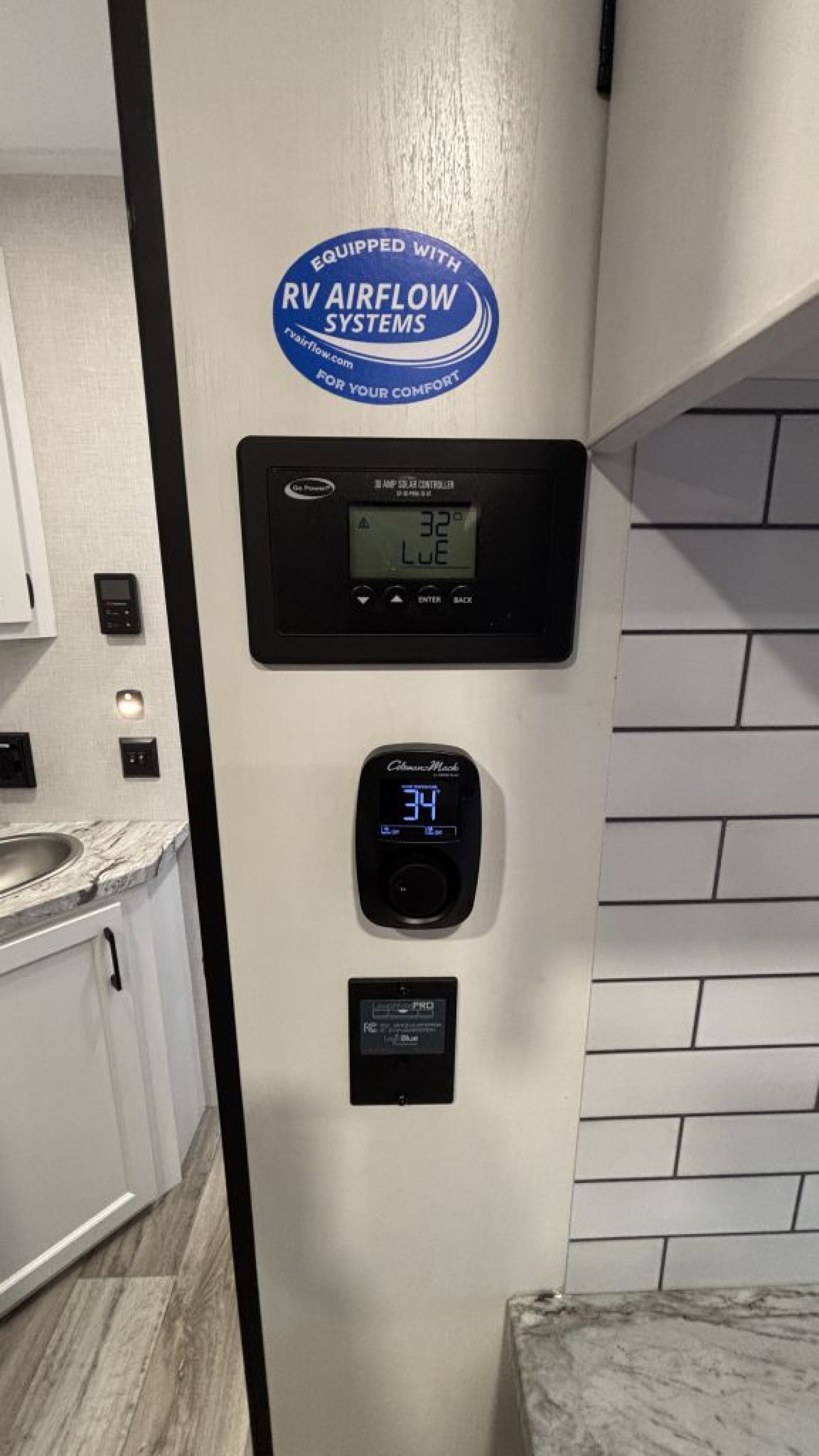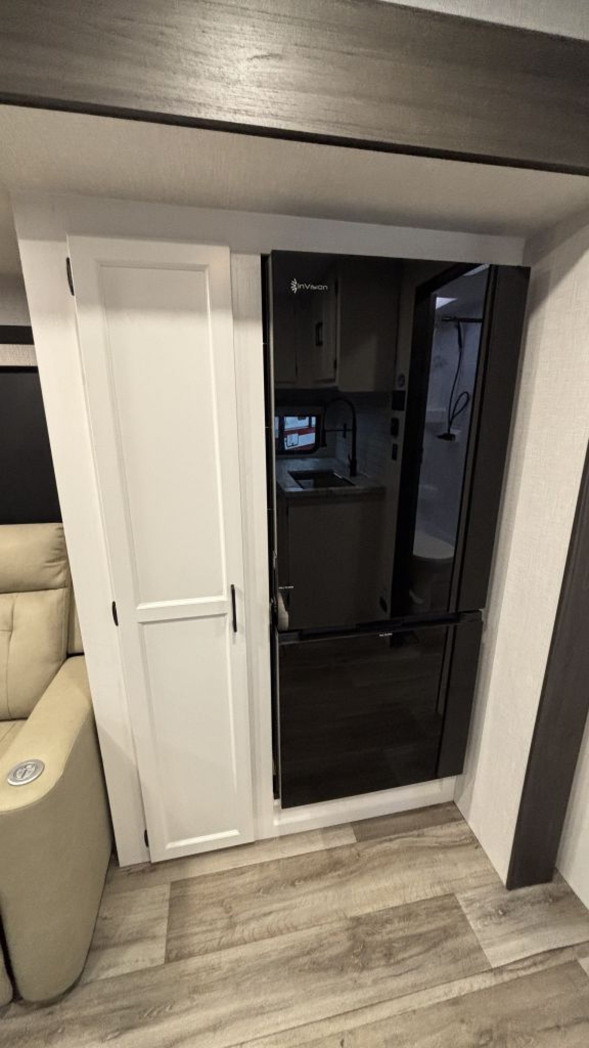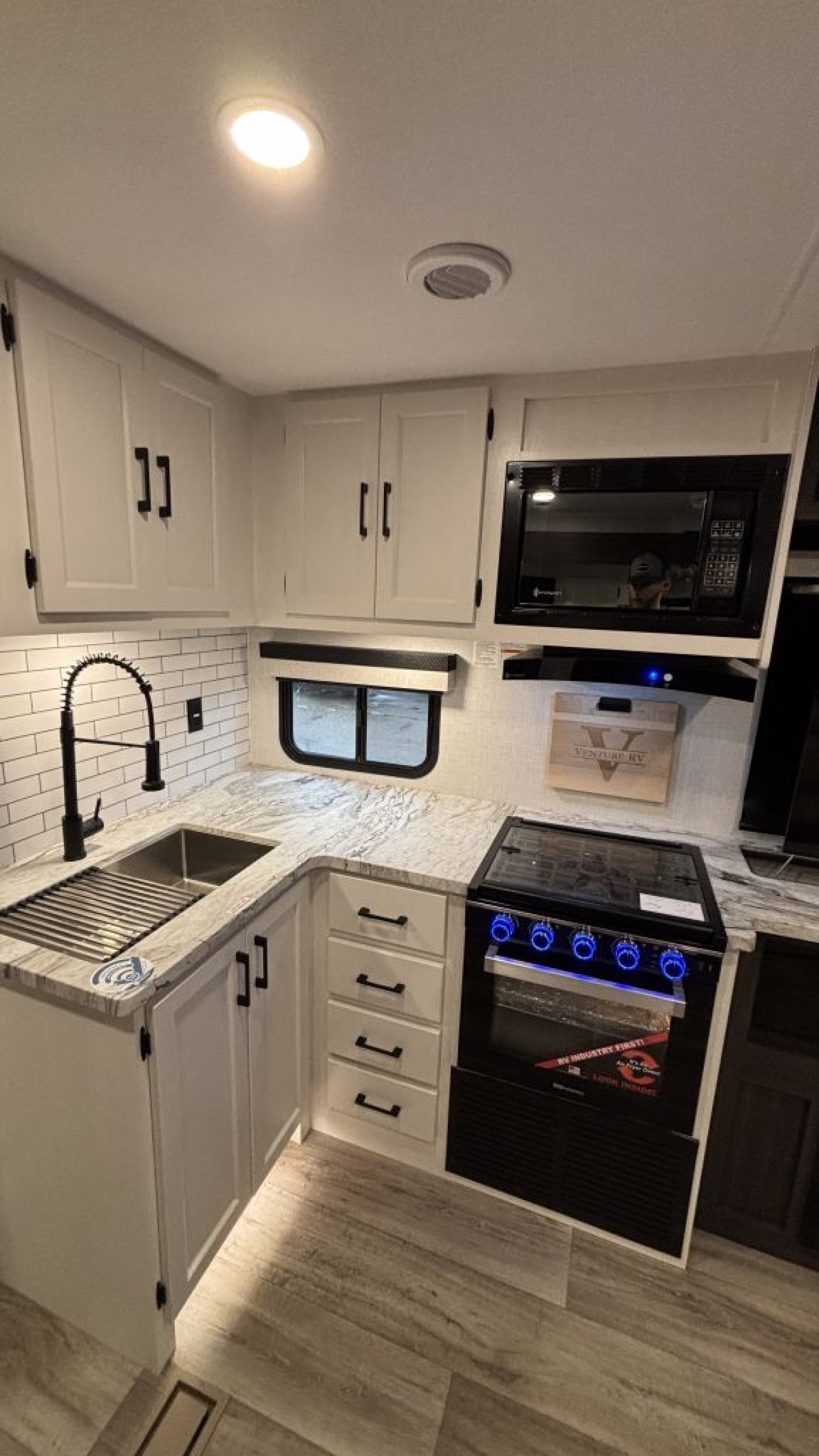 Corner Kitchen: A bright, modern workspace with a 10 cu. ft. 12V refrigerator, a 21-inch Furrion oven with an integrated air fryer, and a large farmhouse sink.
