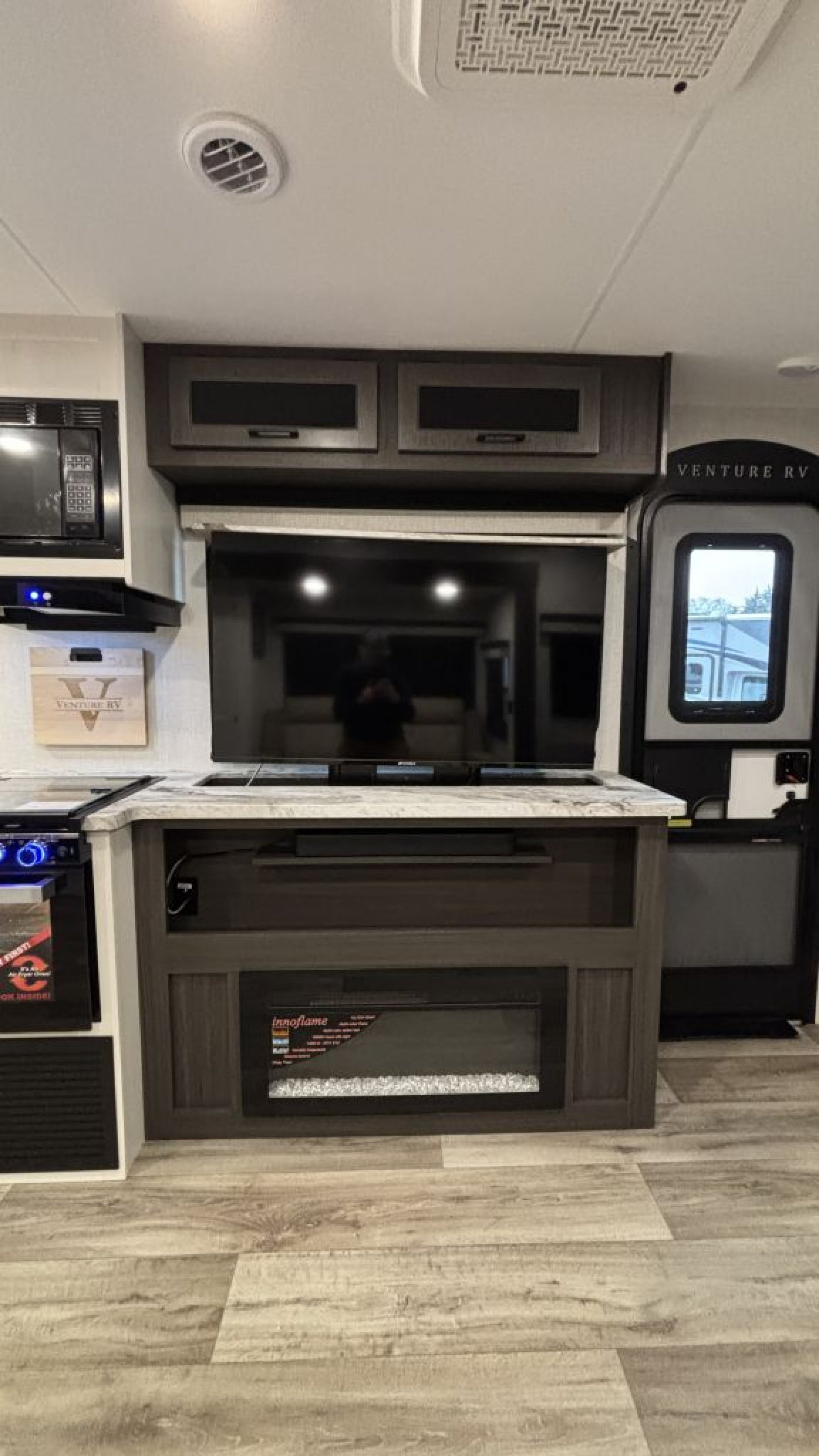 Entertainment on Demand: Features a 50-inch Smart TV on a power lift (hidden when not in use to provide more counter space) and a 5,000 BTU frameless electric fireplace.