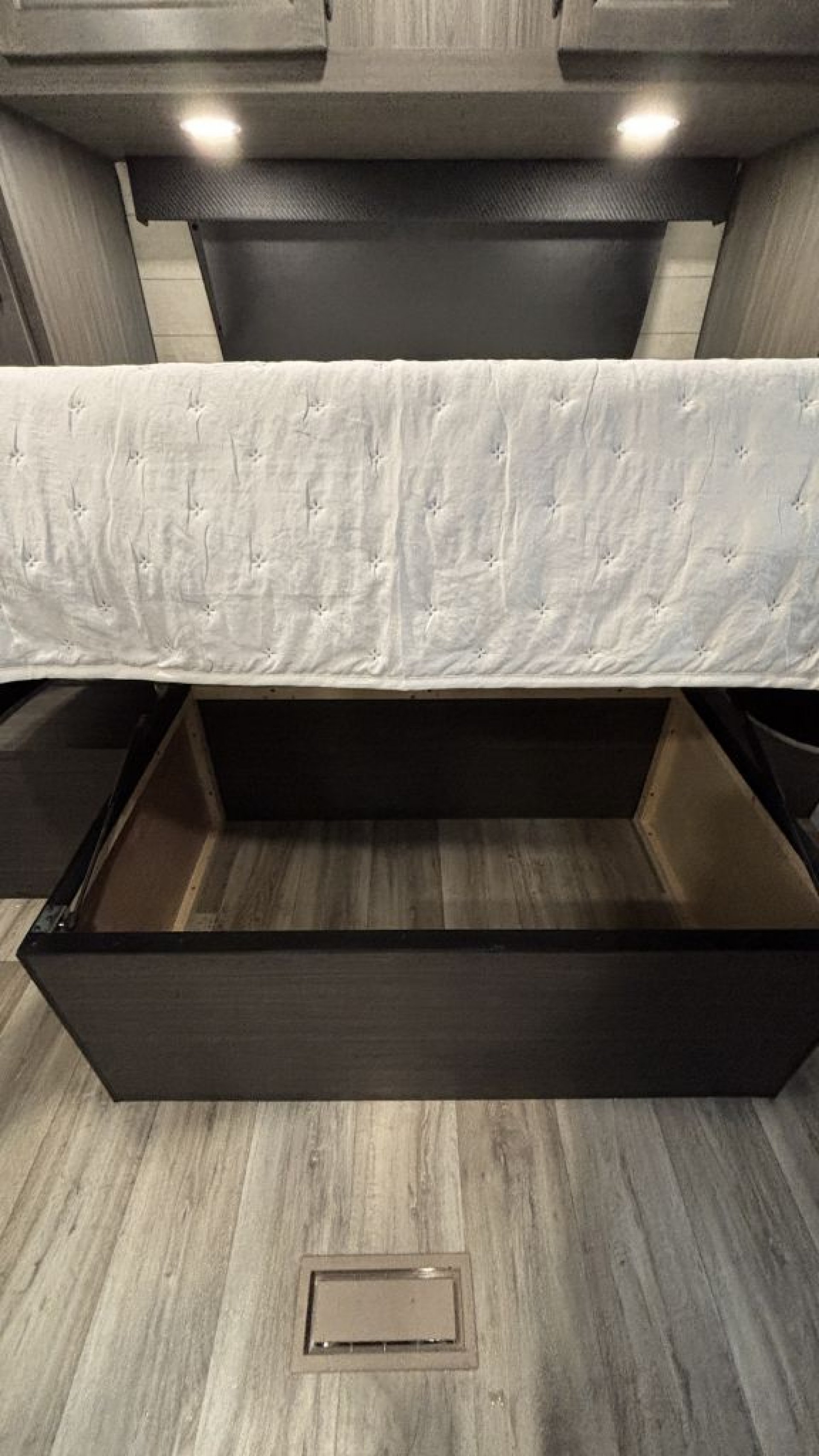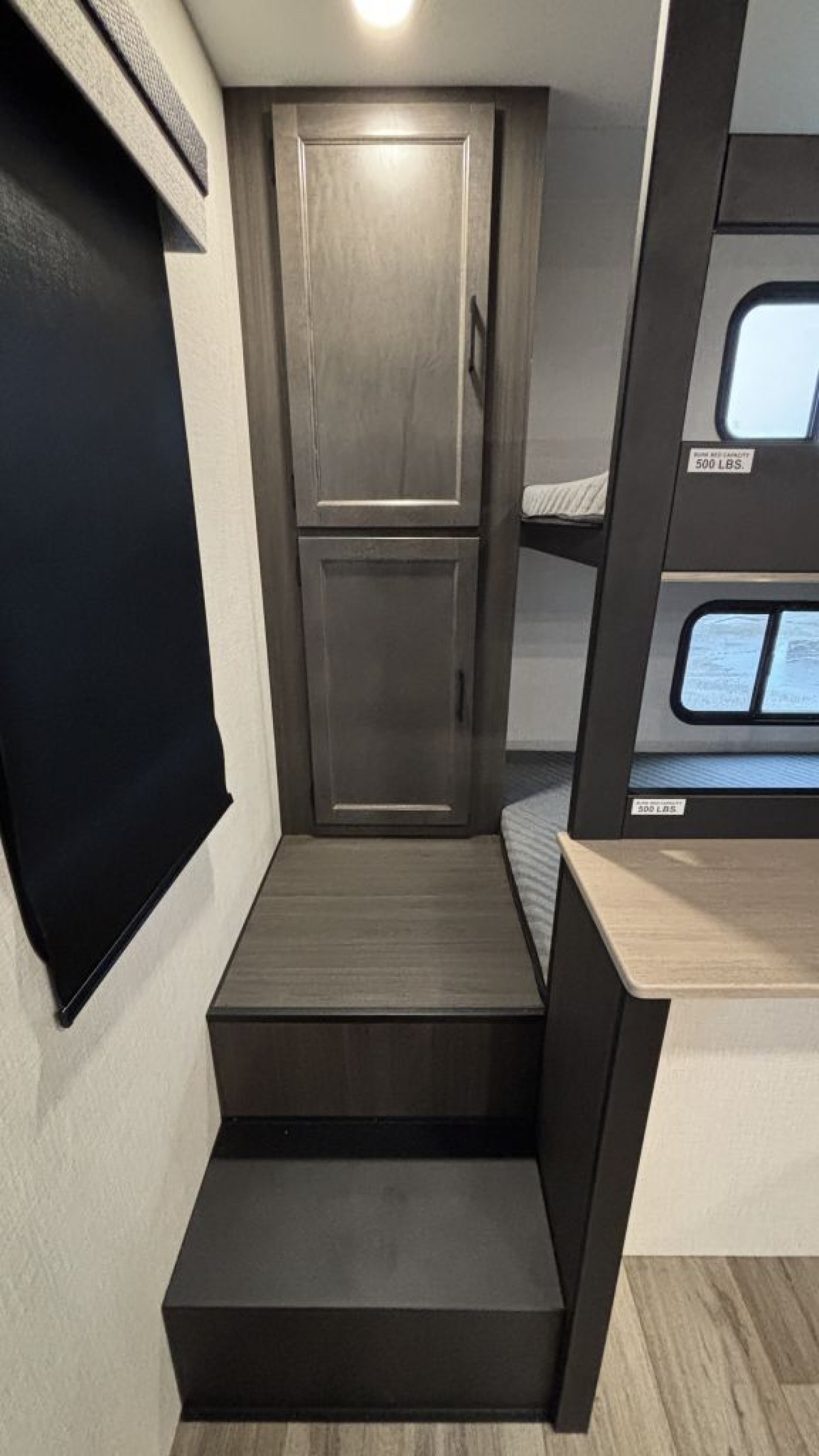 The "Double-Double" Bunks: Located in the rear, these 40" x 70" double-stacked bunks provide plenty of room for kids or adult guests, complete with a dedicated wardrobe and USB charging ports.
