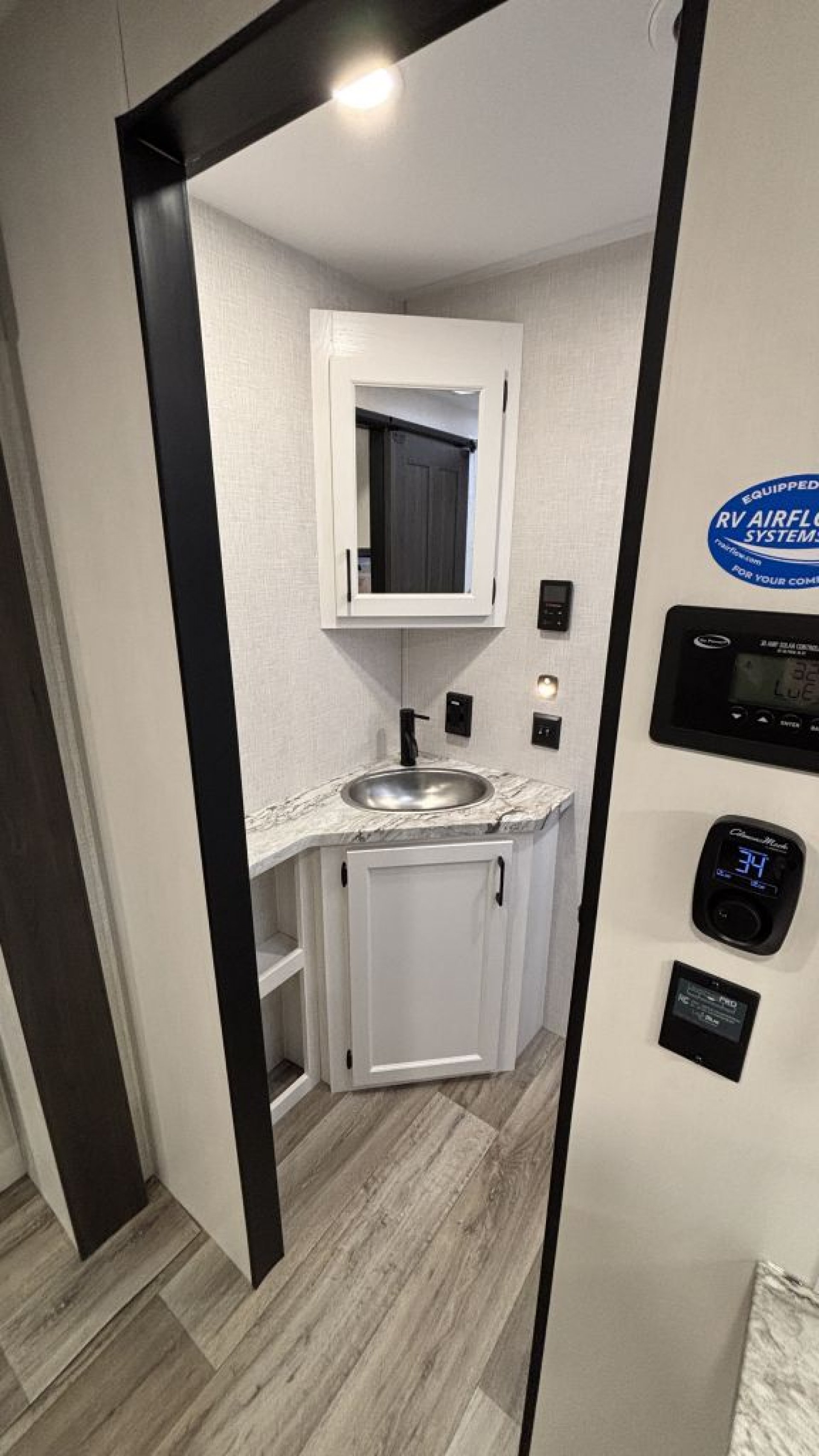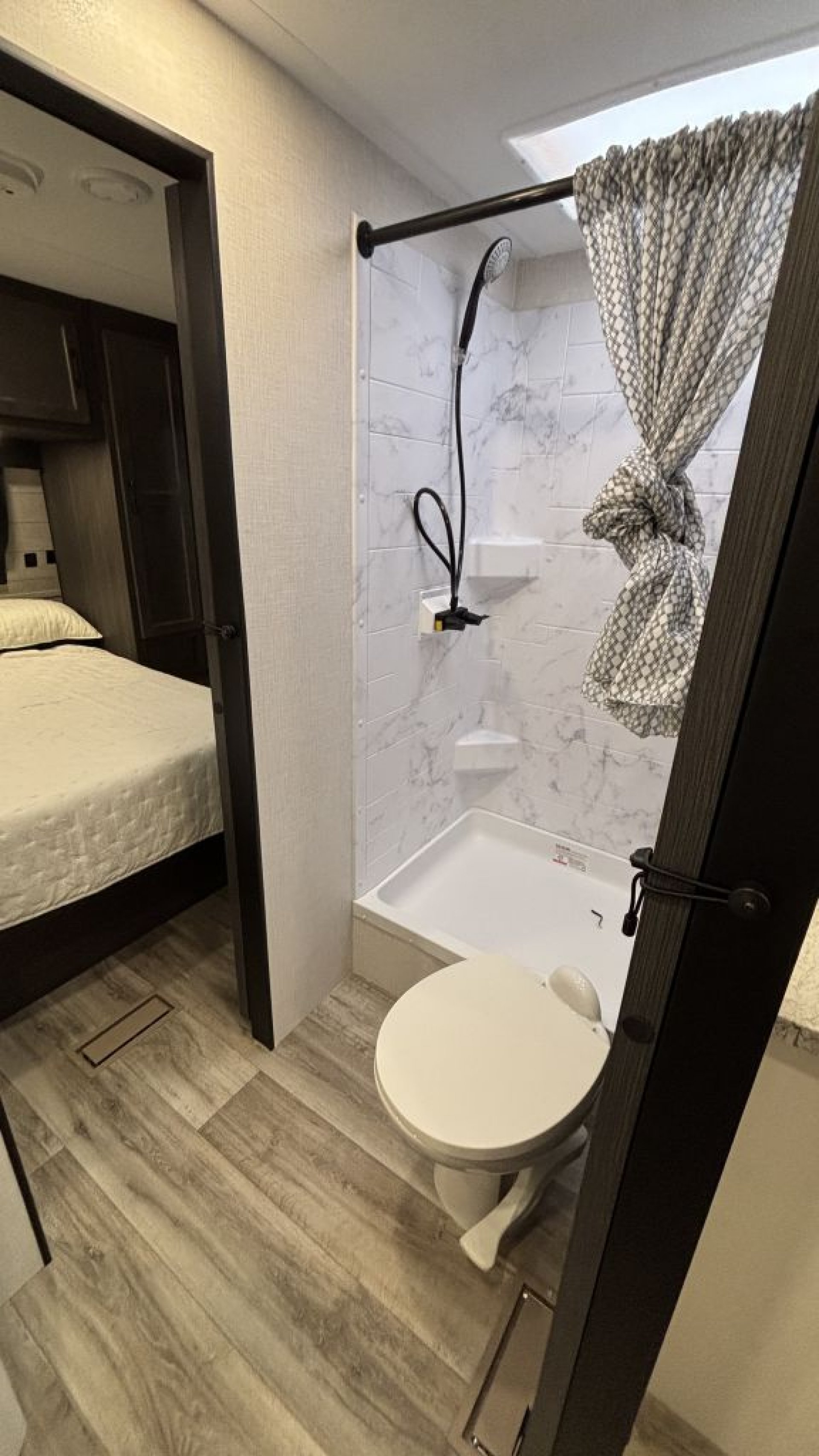 Walk-Thru Bathroom: This central bath acts as a spacious privacy barrier between the kids' bunks and the master suite, featuring a 30" x 36" residential shower with a glass door.