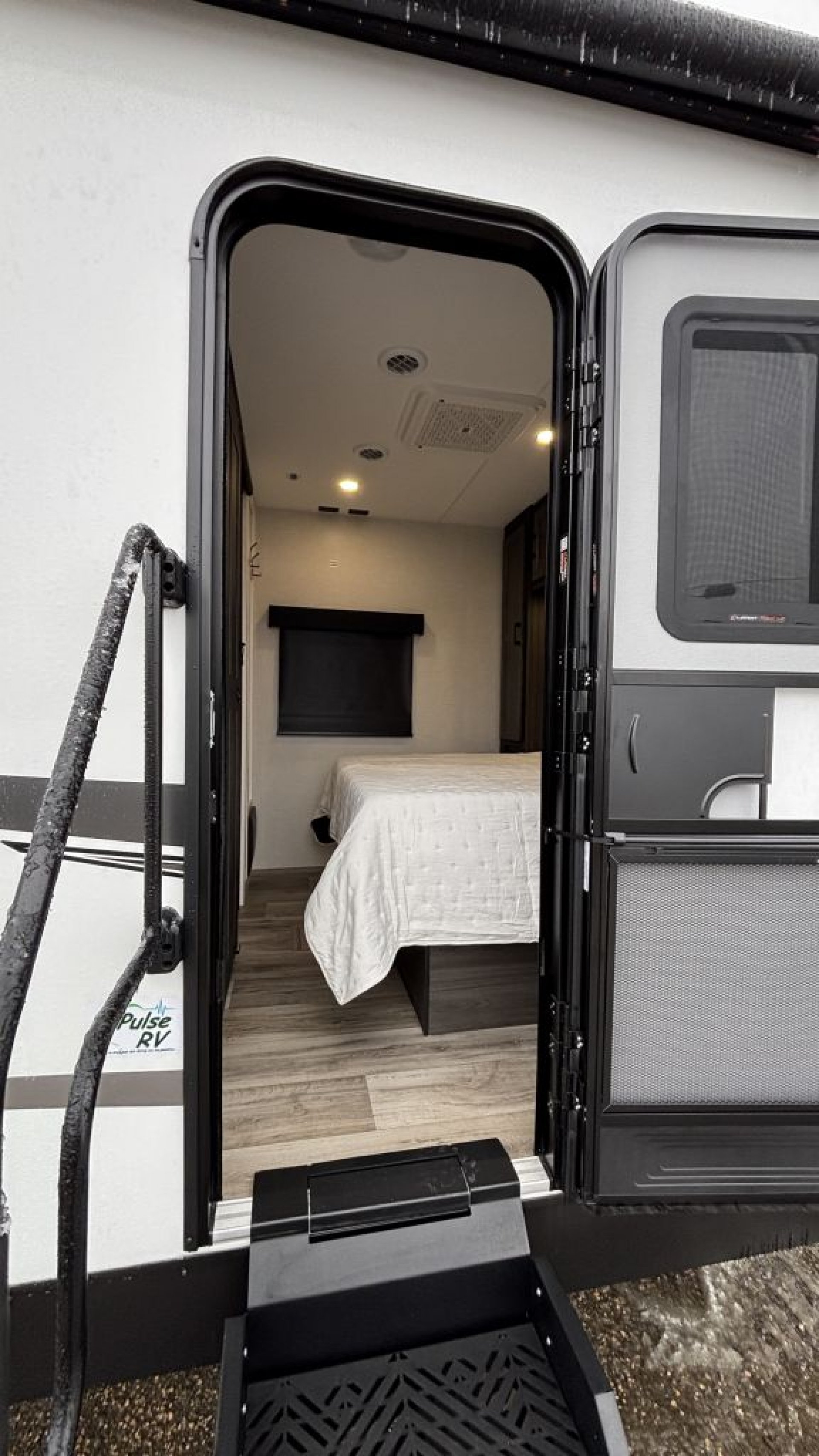 Master Bedroom with a View: Up front, you’ll find a 60" x 80" Serta Memory Foam queen bed framed by a stunning automotive-style front windshield. It also features its own private exterior entrance—perfect for sneaking out to the campfire after the kids are asleep.