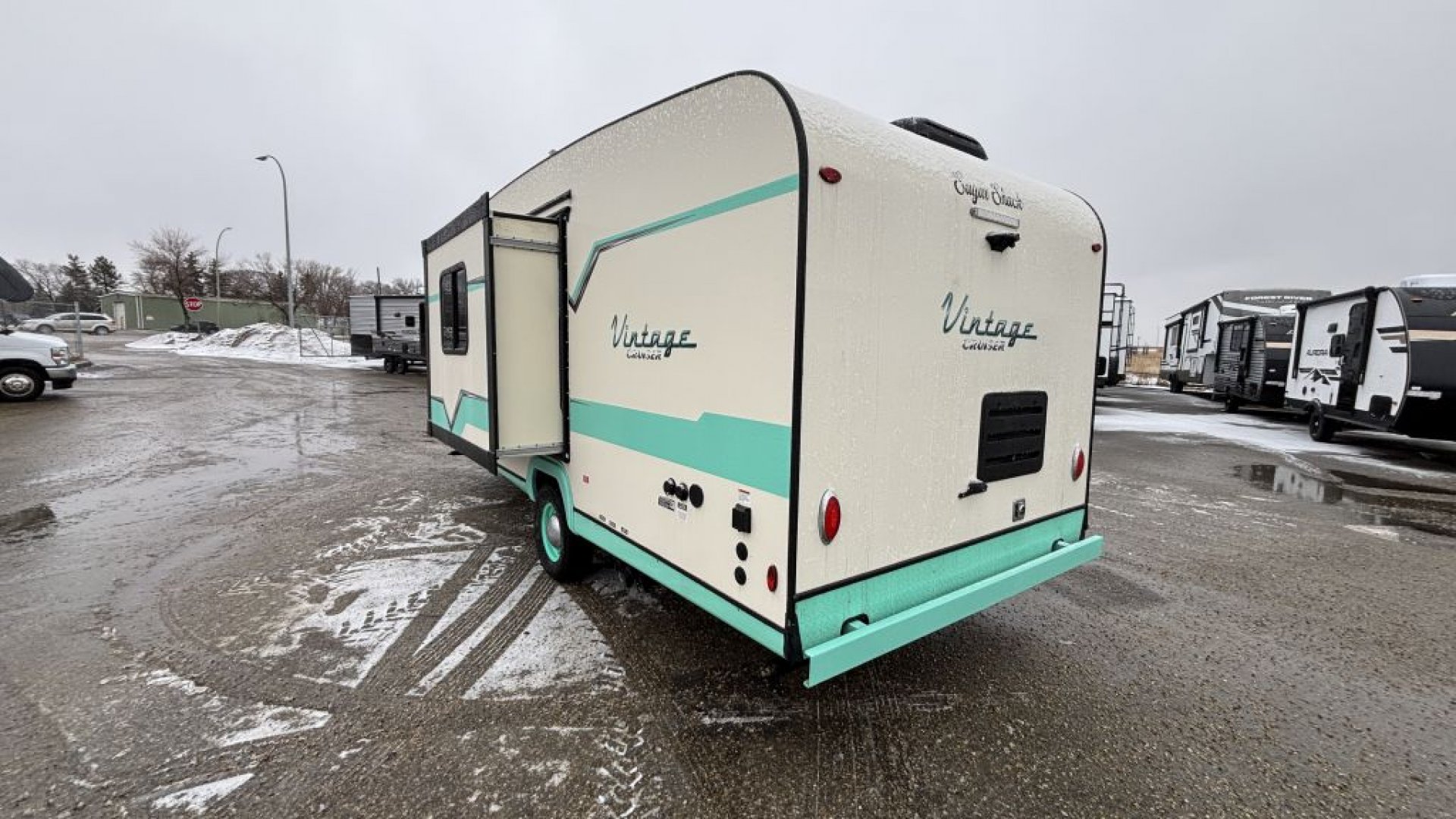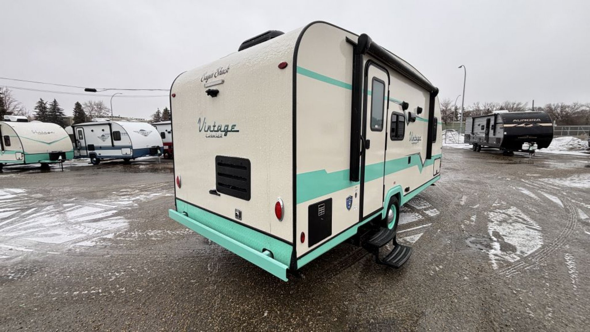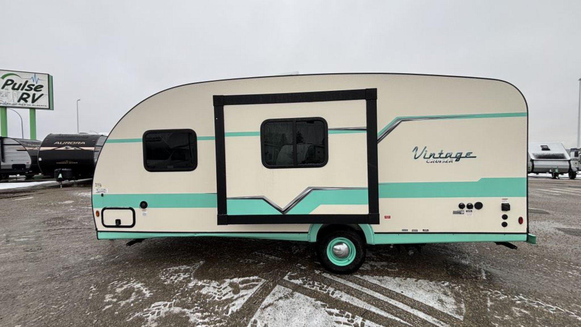 The 2023 Gulf Stream Vintage Cruiser 19CS is a "retro-modern" masterpiece that blends 1950s aesthetic—with lightweight, 21st-century construction. The "CS" stands for Camp-Side Dinette, putting your dining window right where the action is under the awning.