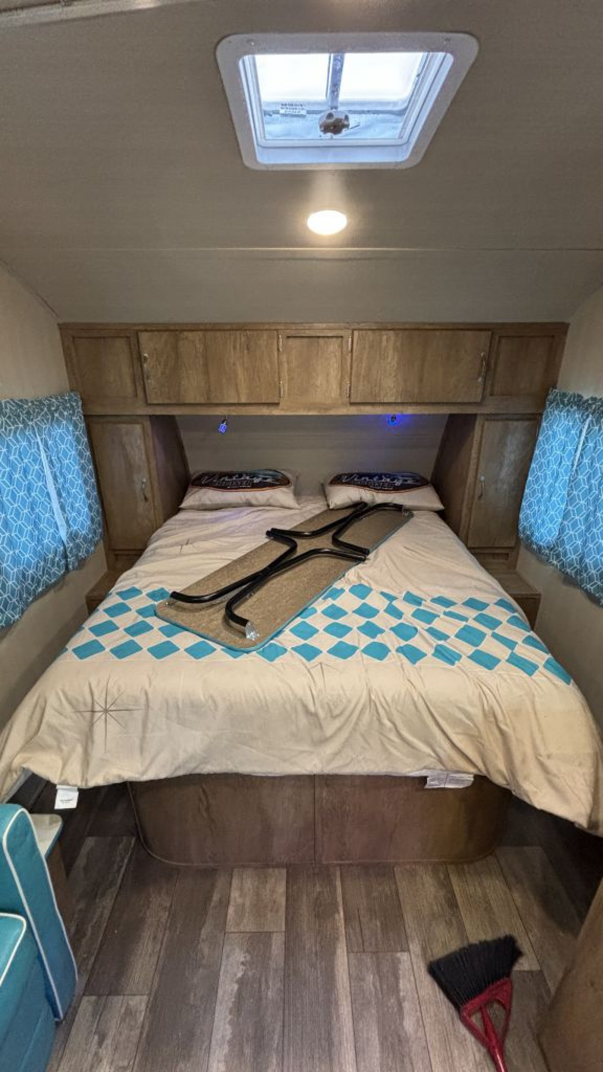 • Front Queen Bedroom: Features a walk-around 60" x 74" Queen bed with vintage-style overhead cabinets and side wardrobes for a cozy, nostalgic feel.