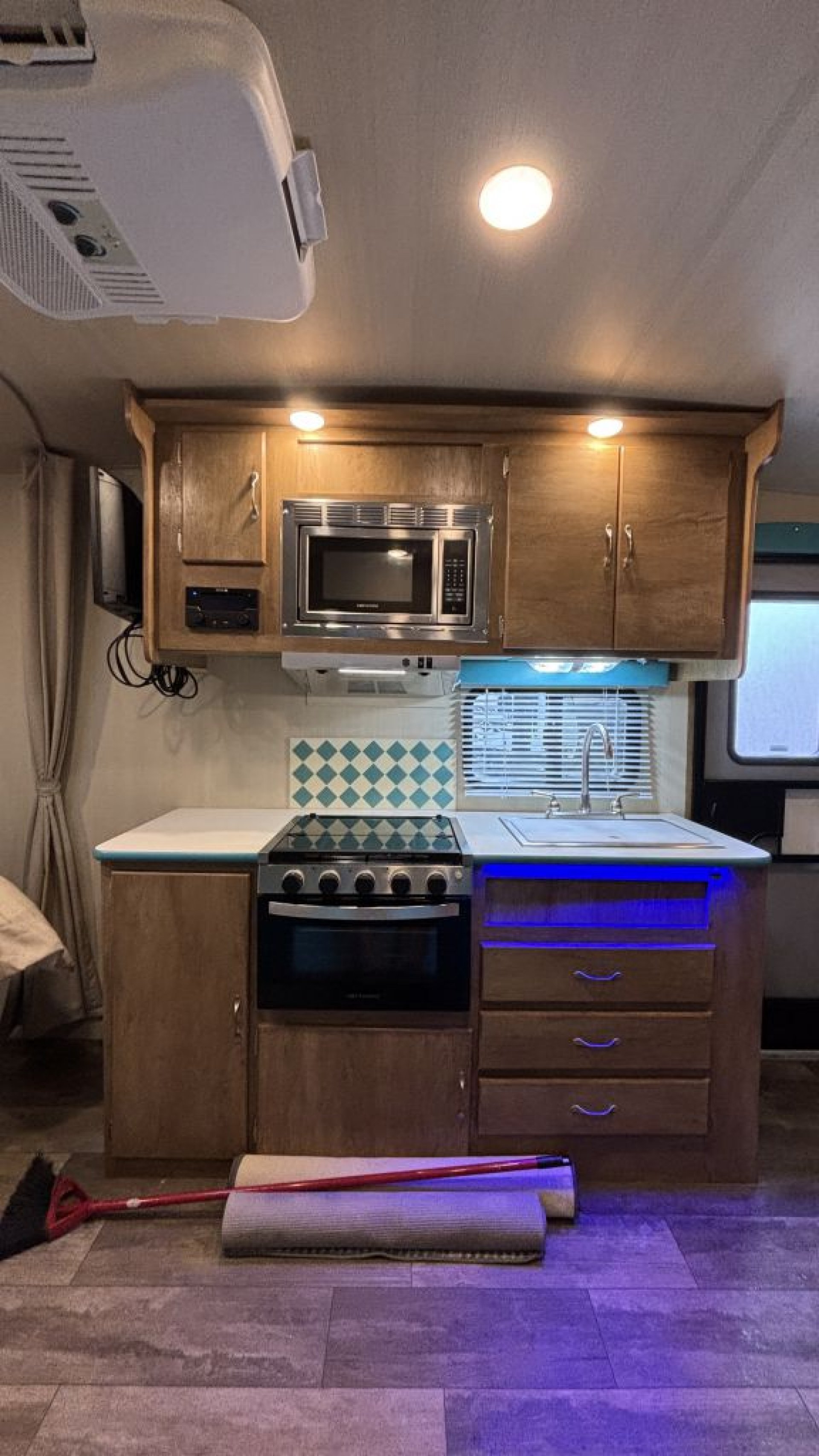• Kitchen Slide-Out: The deep slide-out houses the kitchen appliances, which opens up a massive amount of floor space for a 23-foot trailer.